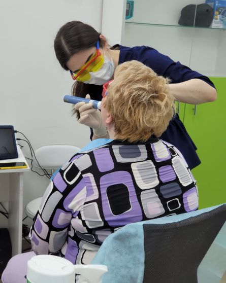 Излучение стоматоскопа направляют в полость рта и через специальные очки проводят визуальный осмотр всех отделов полости рта